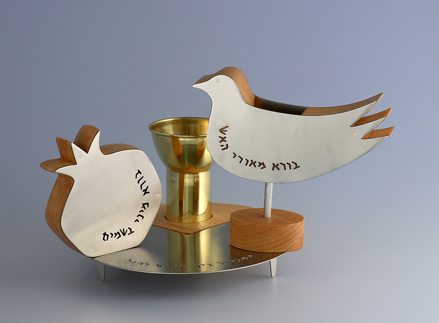 To your Saturday night table, As the Sabbath departs, a touching ceremony takes place with wine, spices, and a candle. it features a platter, a kiddush cup, a spice box, and a candle holder; -The platter has the closing text of the havdalah blessing Hamavdil Ben Kodesh Lechol (“The One who separates between Holy and secular”) in Hebrew penetrating the metal. One quarter of the platter is a wooden holder for the lustrous kiddush cup. -The spice box, in the shape of a fish, a pomegranate or a dove (depands on the set you choose), is wood covered with a metal sheet front and back. The closing words to the blessing over smelling the spices, ‘Borei minei besamim’ (Who created varieties of aromatic spices) penetrate the metal sheet to allow the aroma of the spices to come through. -The candle holder holds standard rectangular havdalah candles. It is in the shape of a pomegranate or a dove (depands on the set you choose), and is made of wood covered with a metal sheet front and back. The closing words to the blessing over the candle, “Borei me’orei ha’eish” (Who created the lights of the fire) penetrate the metal sheet to reveal the wood below. Shabbat Shalom!