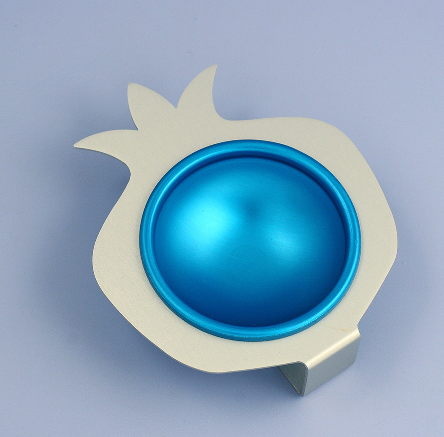 This honey dish, product of Judaica artist ,Shraga Landesman, is Made from anodised aluminum, and it is shaped like a pomegranate with a matching bowl. This serving item suitable for any holiday or festive event!