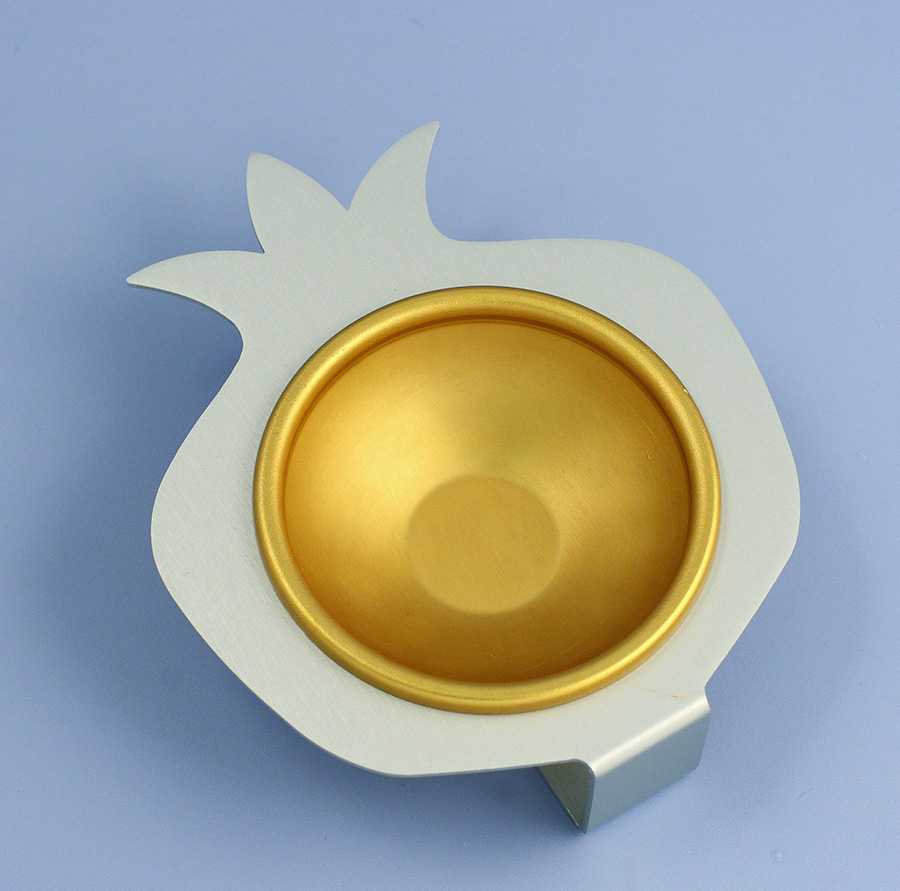 This honey dish, product of Judaica artist ,Shraga Landesman, is Made from anodised aluminum, and it is shaped like a pomegranate with a matching bowl. This serving item suitable for any holiday or festive event!